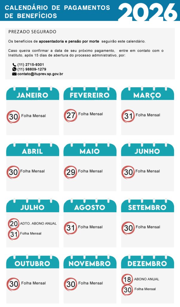 O ITUPREV conta com duas datas para o pagamento de seus benefícios. A folha mensal é sempre paga no último dia útil de cada mês e, para os benefícios concedidos após o fechamento da folha mensal, é feita uma folha complementar com pagamento no dia 15 do mês seguinte.
